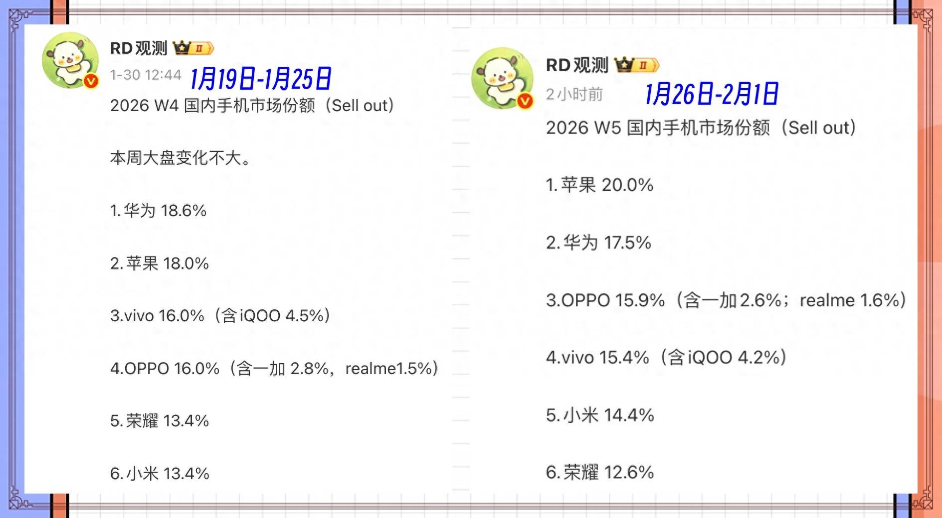 对于2026年W5国内手机排行榜,亓纪的想法是这样的:从本周的市场份额来看,苹果和华为各占了一个梯队,剩下的三个厂商占一个梯队。其中最近几周的小米有点掉队,所以下周的榜单还是挺值得期待的,看看小米能不能与OV大厂在成绩上打成一片。从目前的爆料来看,iQOO15 Ultra应该是春节前的最后一款新机,所以后续的数据应该不会有太明显的改变。